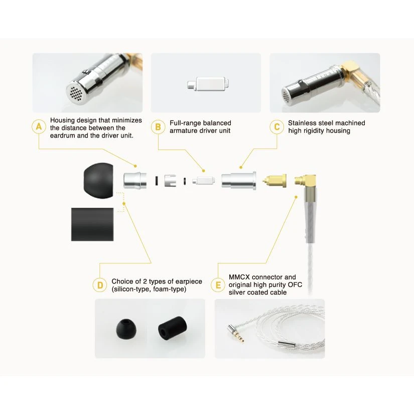 Housing design that minimizes the distance between the ear drum and the driver unit. You can position the product to be at the back or at the entrance of the ear canal, and change the sound quality by choosing different earpieces.